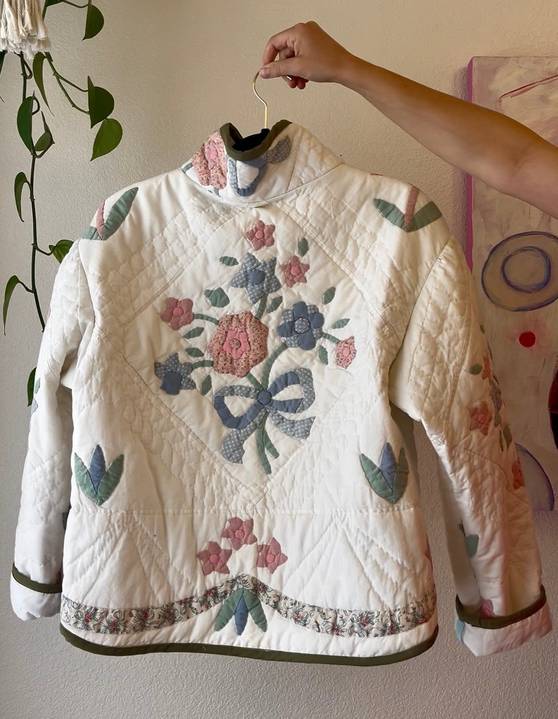 Handmade Quilt Jacket cut from a vintage quilt. Slight wear and discoloration is expected due to the age of the quilt. Pockets and snap closures on the front.